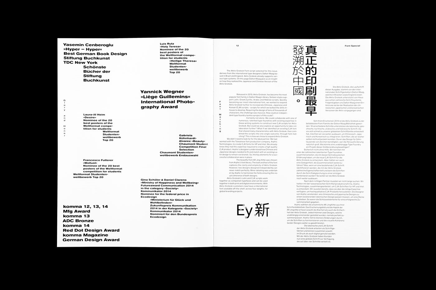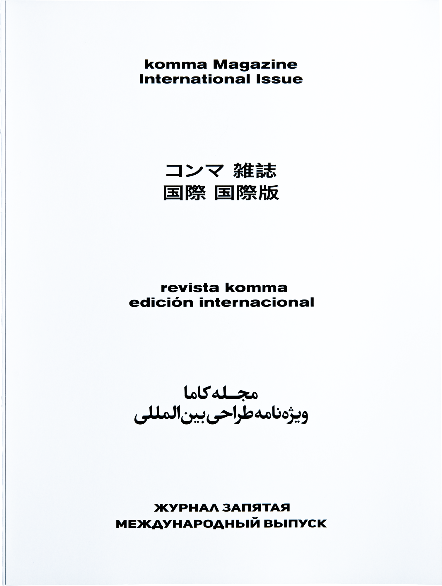16th edition of the komma magazine we dare to go international. Several art works and interviews from various countries enrich this issue and show a colorful variety. Therefore, for the first time the magazine has been designed multilingual. All texts have been translated into English or are kept in the respective native language of the designers. To mirror the openness shown to us by international designers, we decided for an open spine which at the same time refers to the vulnerability of international relations. To