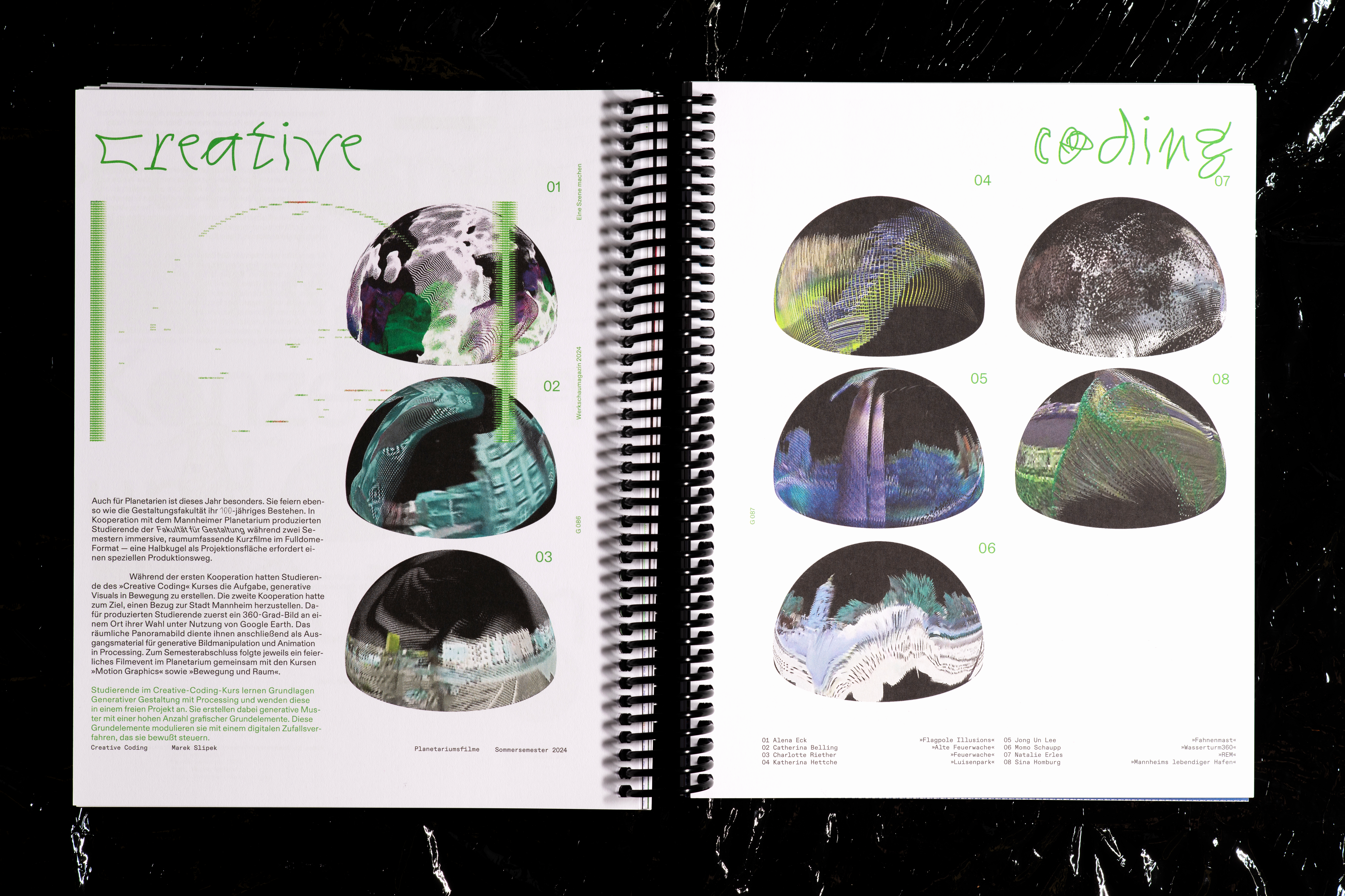 The magazine’s standout feature is affectionately called the “chunky plastic spiral,” along with colorful chapter dividers that segment the content. The cover begins in symbolic solid black, transitions to vibrant colors inside, and concludes with a white back cover. As part of the launch event, several covers were spray-painted with red, blue, and green paint, forming a collective artwork. Throughout the rest of the exhibition, visitors were invited to take creative control, customizing their own copies as they pleased.